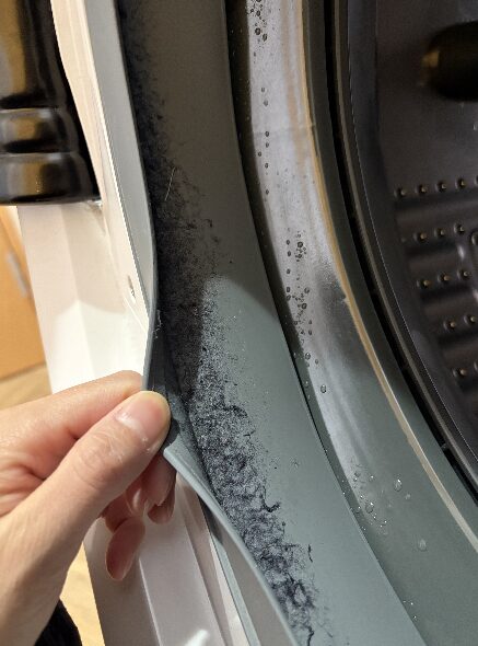 洗濯乾燥機のドア周りのゴムパッキンに、乾燥時に出る繊維くずが固まって残っていた、という指摘がありました。